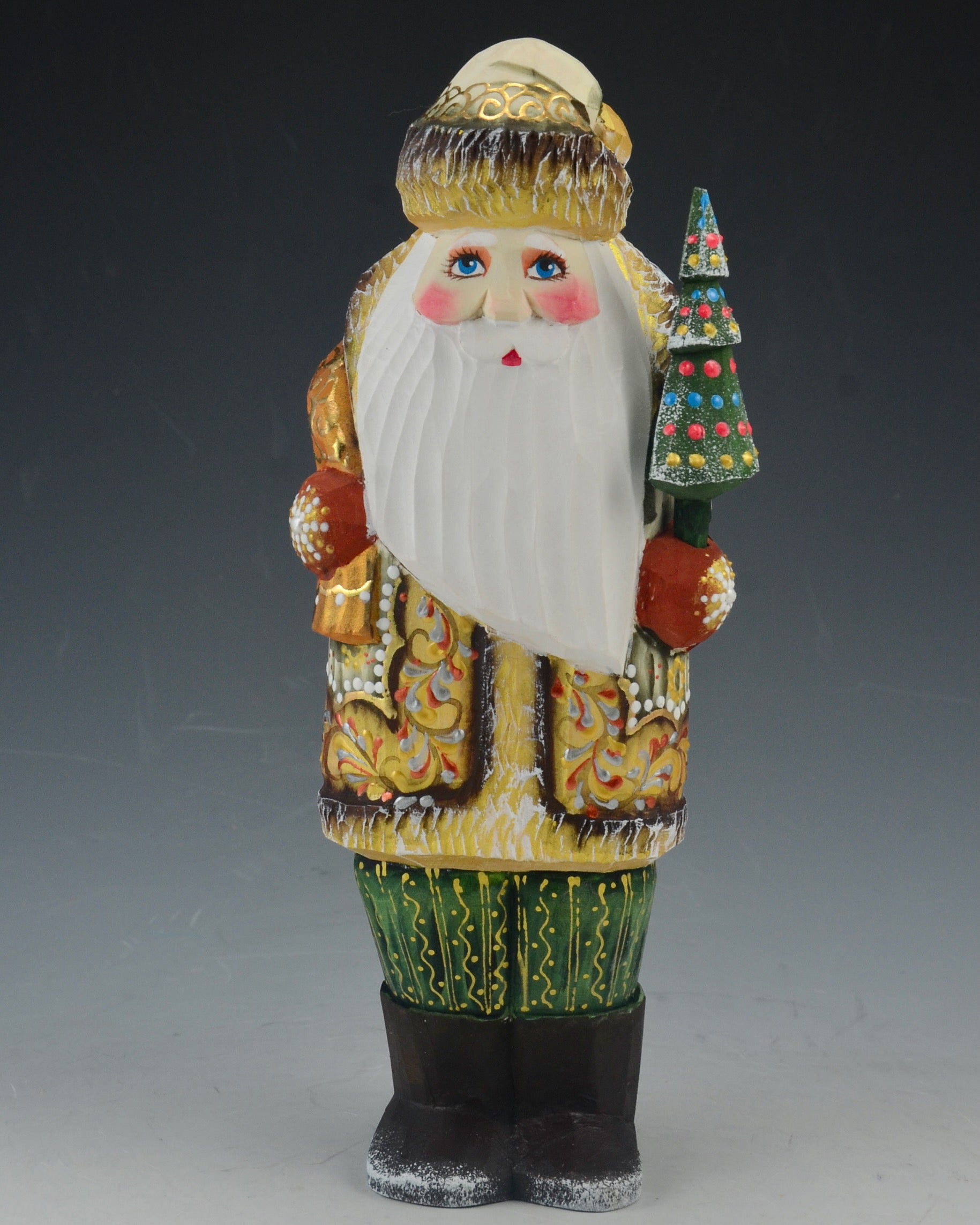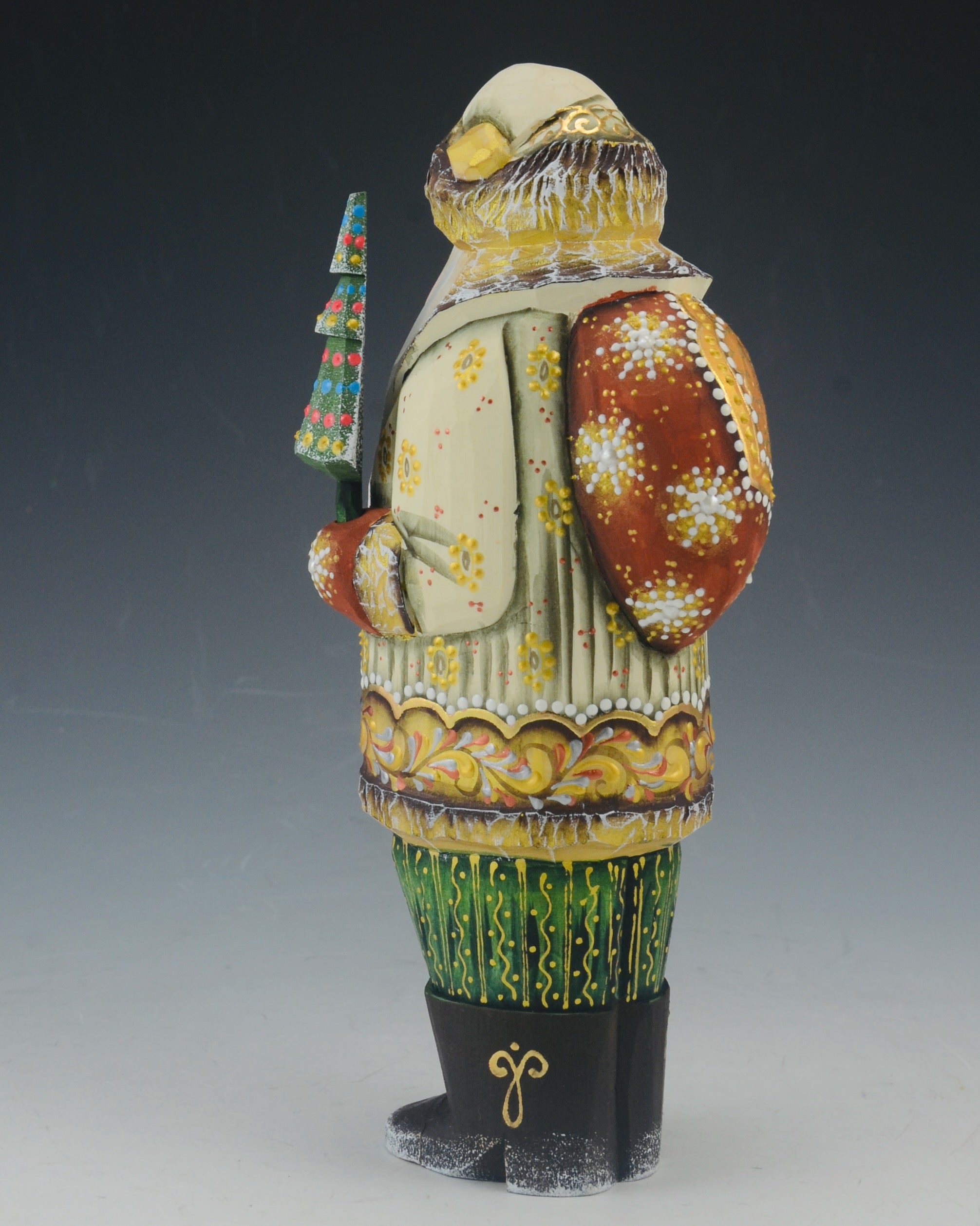 Green and cream toned Russian Santa with gold trim, toy bag and Christmas Tree. This Russian Santa is hand carved from solid linden. Once carved and sanded the Santa is hand painted and finished with numerous coats and finally signed by the artist. Material: linden wood: 8 inches HHand carved solid wood