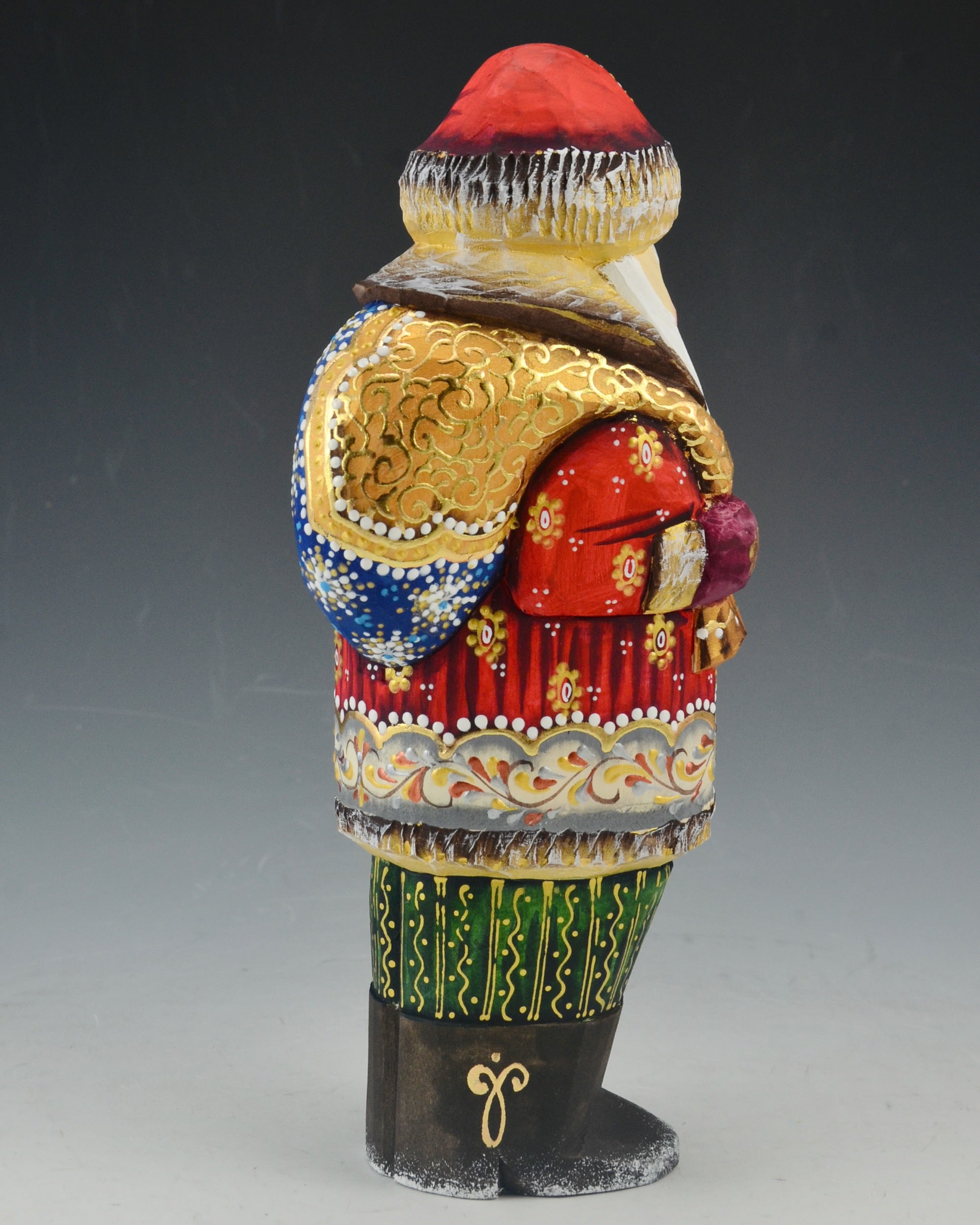 Red and Green toned Russian Santa with gold trim, toy bag and Christmas Tree. This Russian Santa is hand carved from solid linden. Once carved and sanded the Santa is hand painted and finished with numerous coats and finally signed by the artist. Material: linden wood: 8 inches HHand carved solid wood