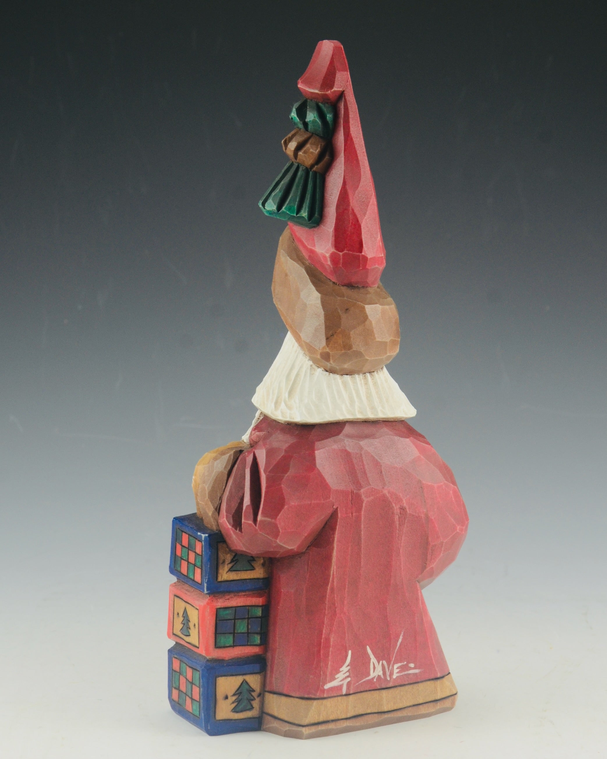 Tall hat Santa carving holding a heart and blocks by his side spelling the word Joy. A wonderfully themed Santa Claus creation with woodburned detail. Hand carved and hand painted Santa carving by Canadian Carver Dave Francis. Material: Basswood : 9 inches H Hand carved, solid wood