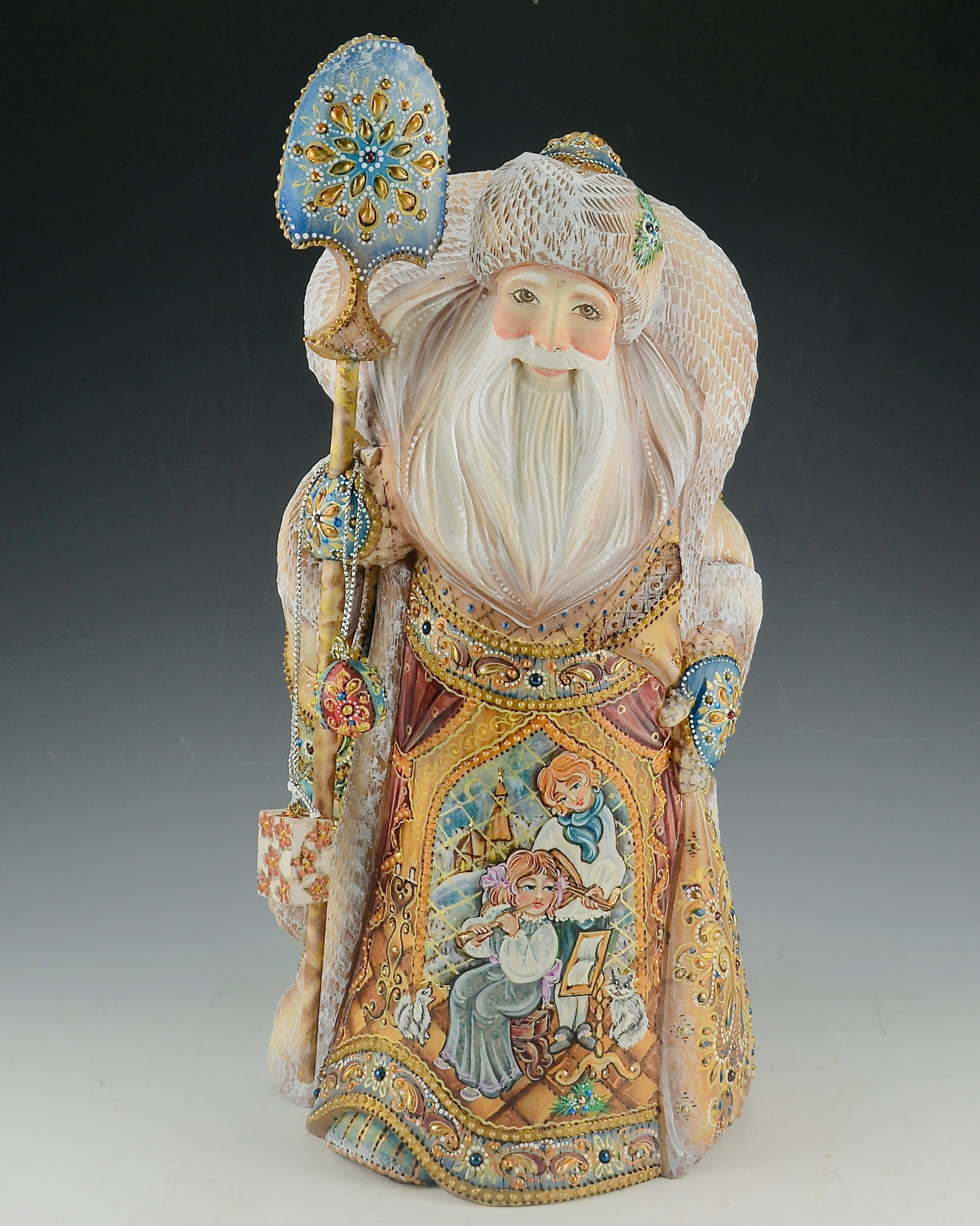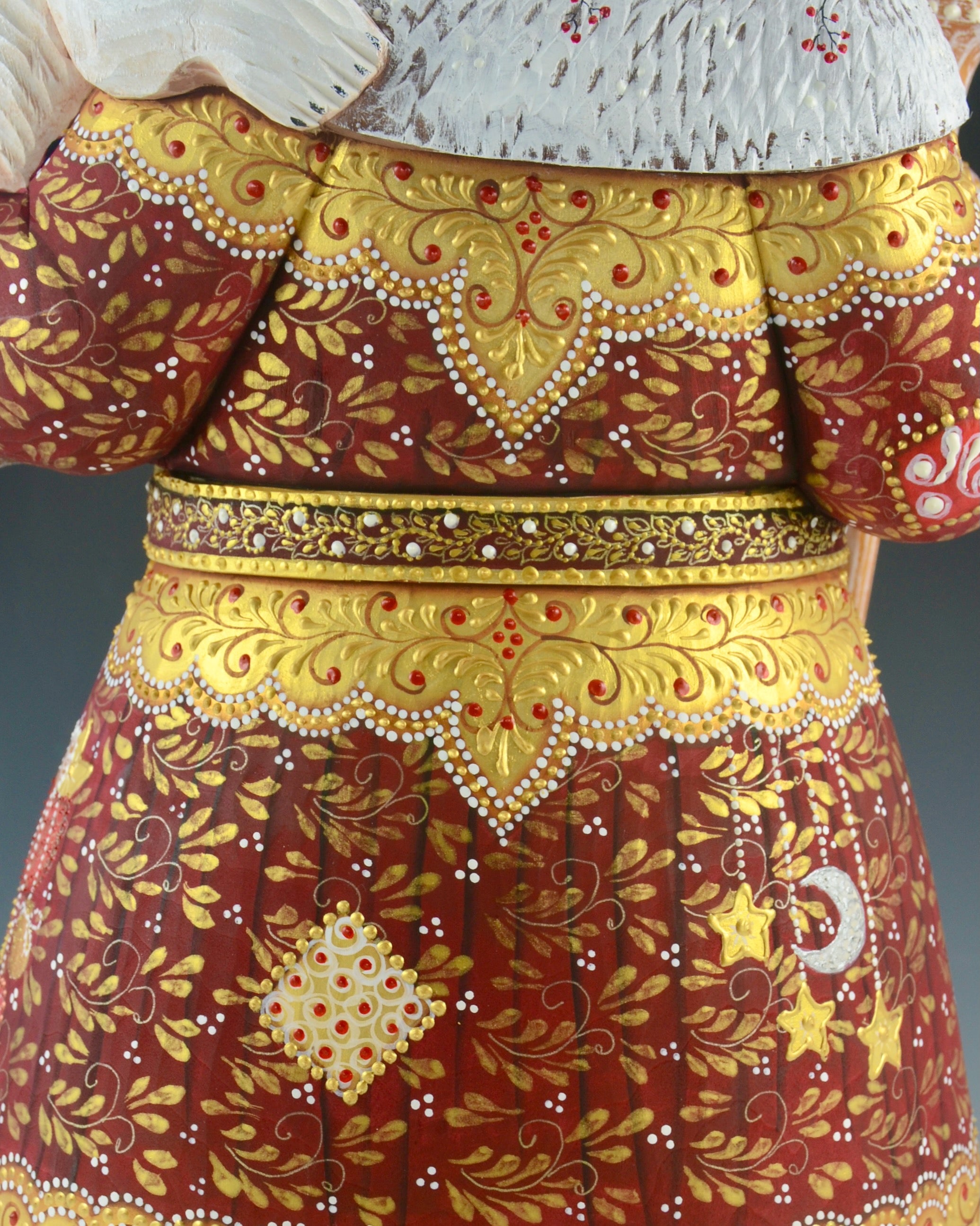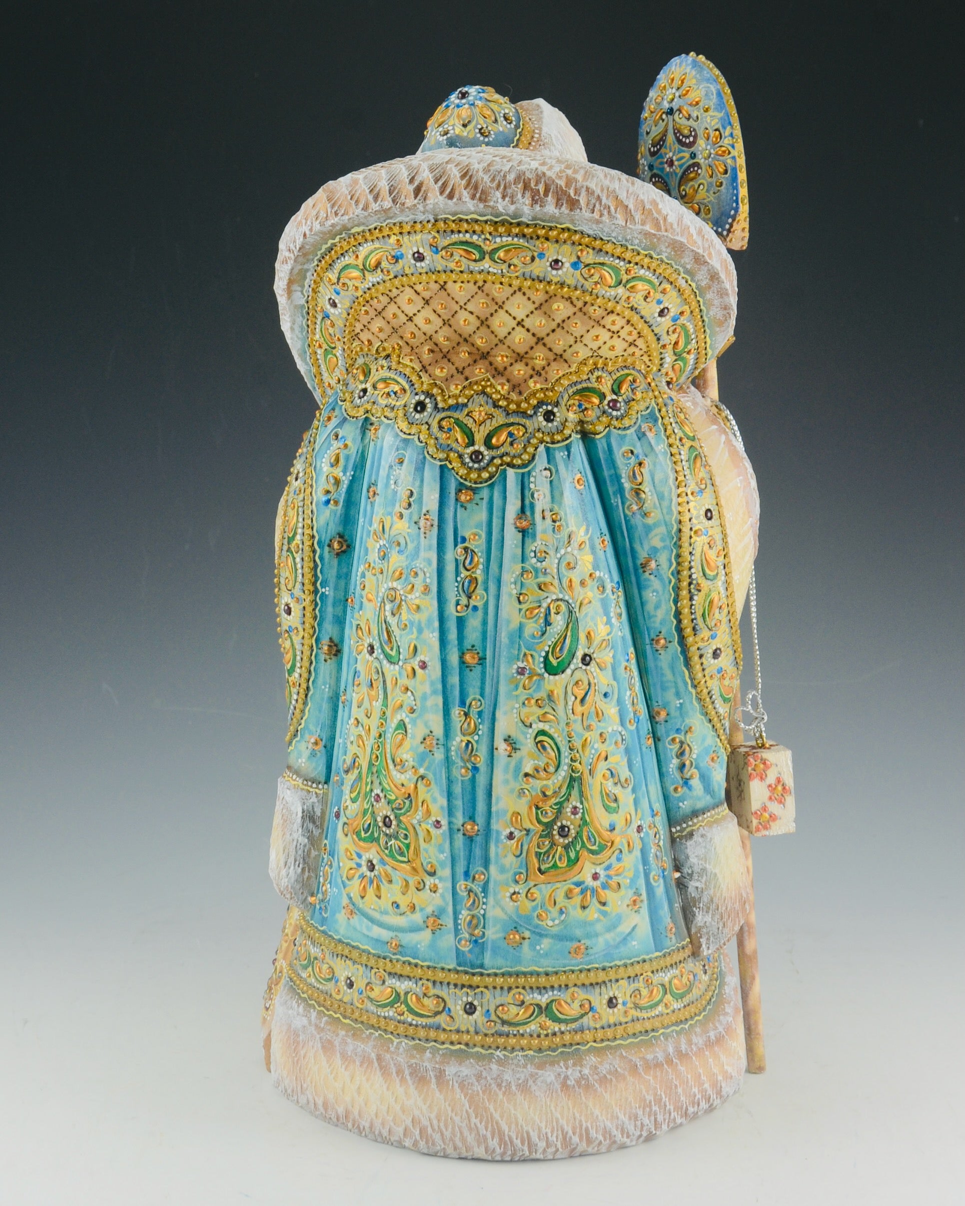 This Russian Santa is artistically painted in numerous coats, intricately detailed, sealed for protection and easy cleaning. All hand carved and hand painted, signed by the artist. One of a kind hand crafted, solid wood carving.