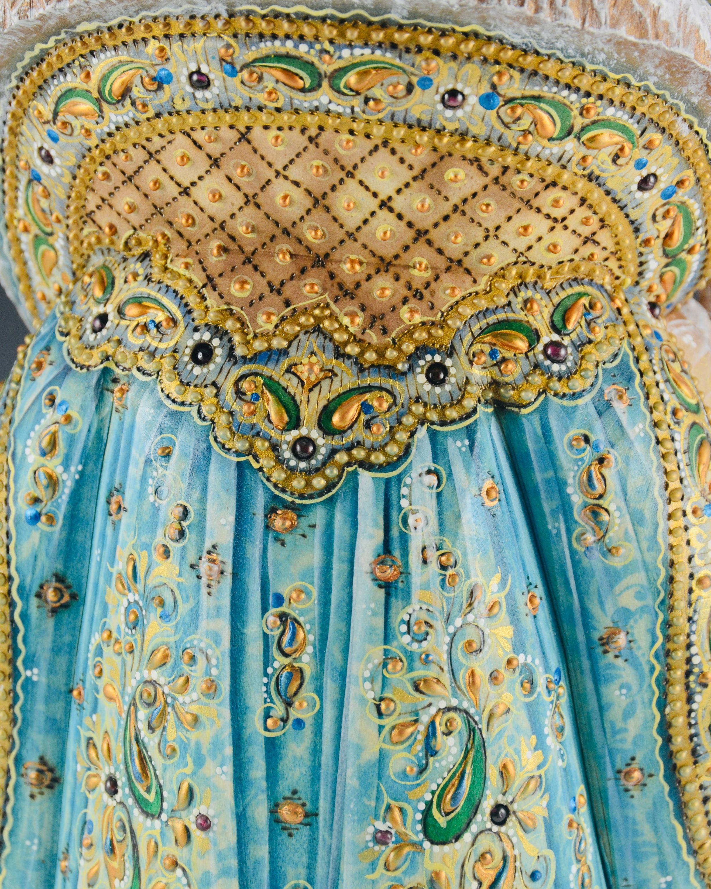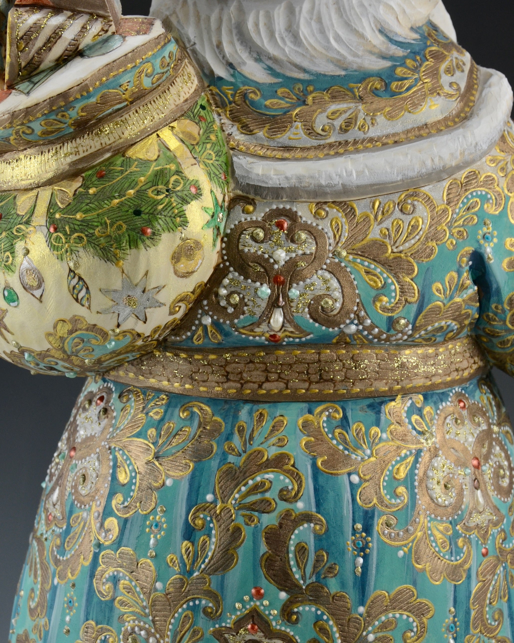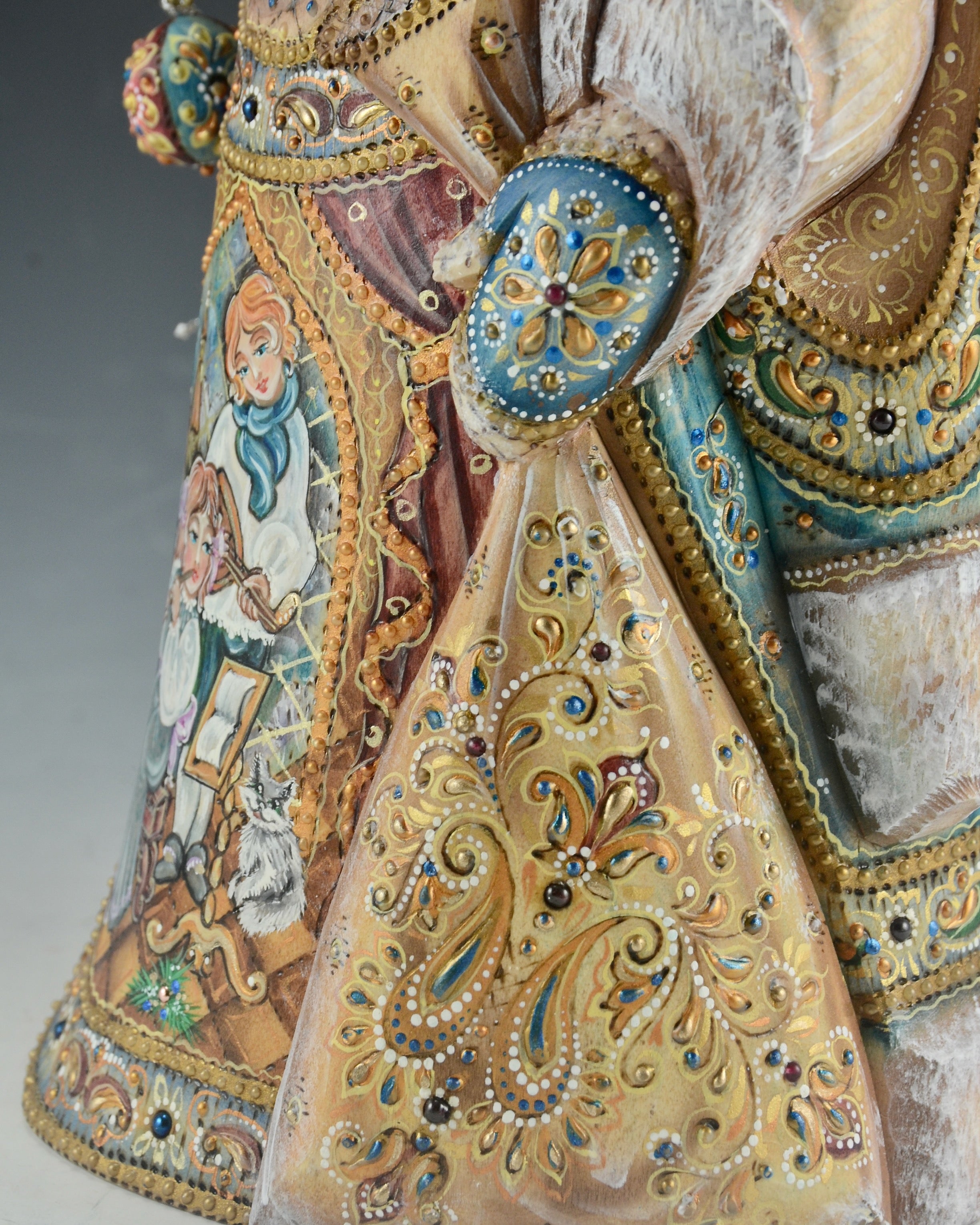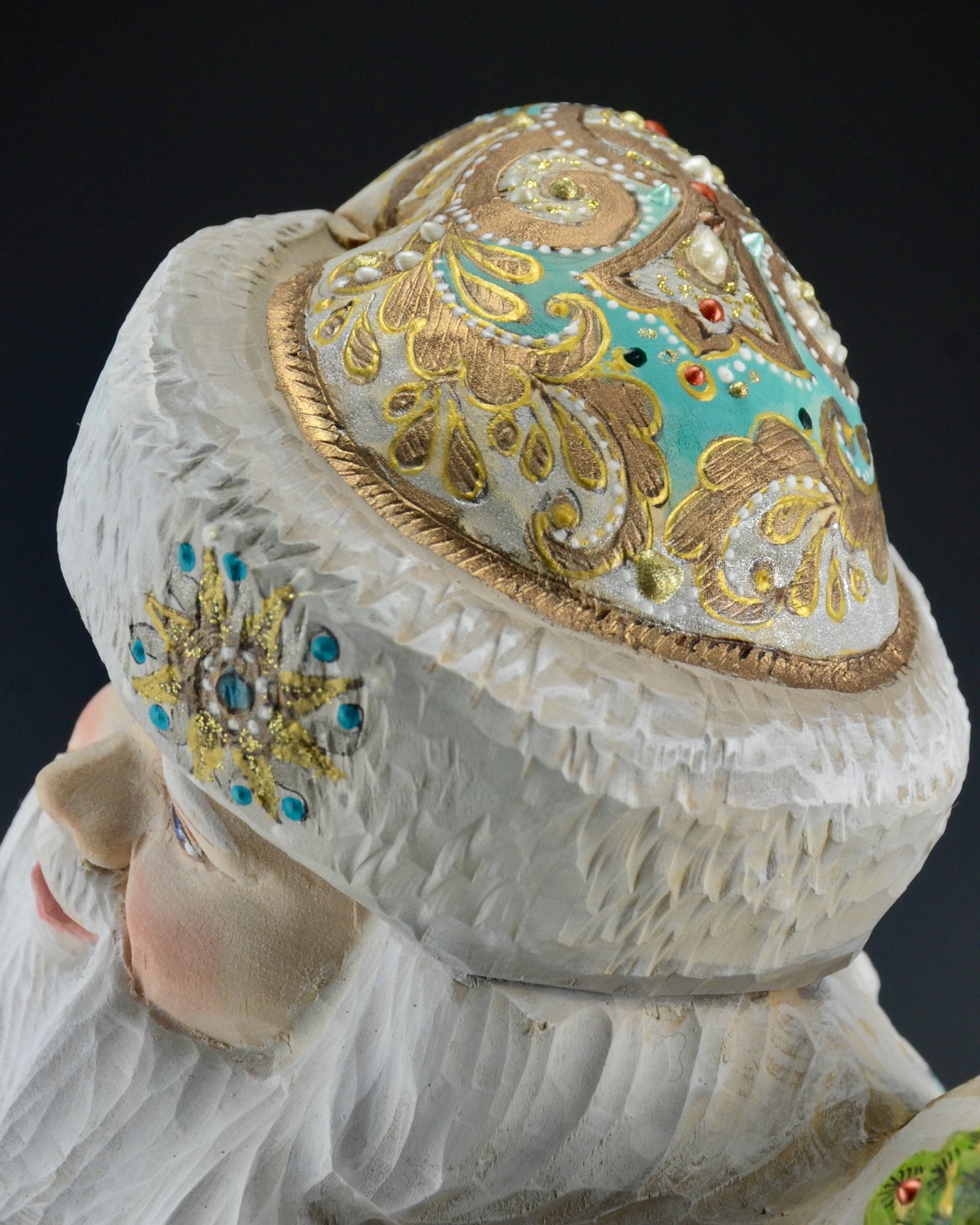 This Russian Santa is artistically painted in numerous coats, intricately detailed, sealed for protection and easy cleaning. All hand carved and hand painted, signed by the artist. One of a kind hand crafted, solid wood carving.