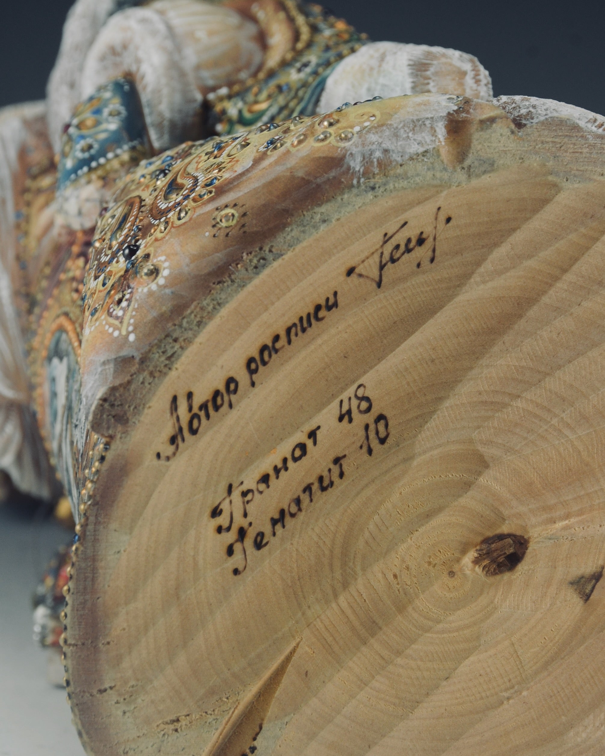 58 semiprecious stones are embedded into this beautiful Santa carving, 48 garnet and 10 hematite. Wonderful painting detail in soft tones throughout accented by Santa's staff and hanging ornaments. This Russian Santa is artistically painted in numerous coats, intricately detailed, sealed for protection and easy cleaning. All hand carved and hand painted, signed by the artist. One of a kind hand crafted, solid wood carving. Material: linden wood : 11.5 H x 5.5 inches diam.(staff 12") Hand carved solid wood