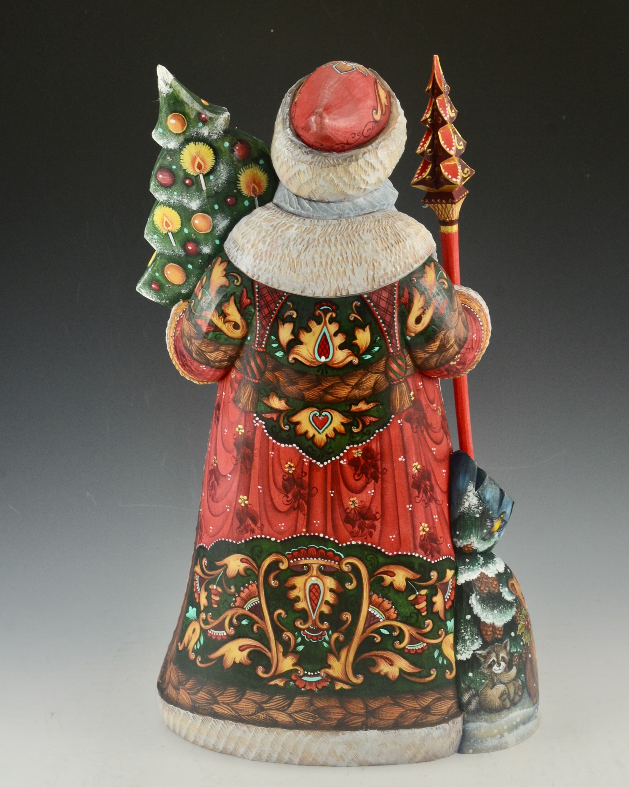 Stunning Russian Santa Claus carving holding a Christmas tree and staff. Extremely detailed painting throughout featuring Santa holding a lantern, surrounded by many animals, bears, fox, owl, deer, raccoon and birds. This Russian Santa is artistically painted in numerous coats, intricately detailed, sealed for protection and easy cleaning. All hand carved and hand painted, signed by the artist. One of a kind hand crafted, solid wood carving. Material: linden wood : 12.7 H (inches) Hand carved solid wood