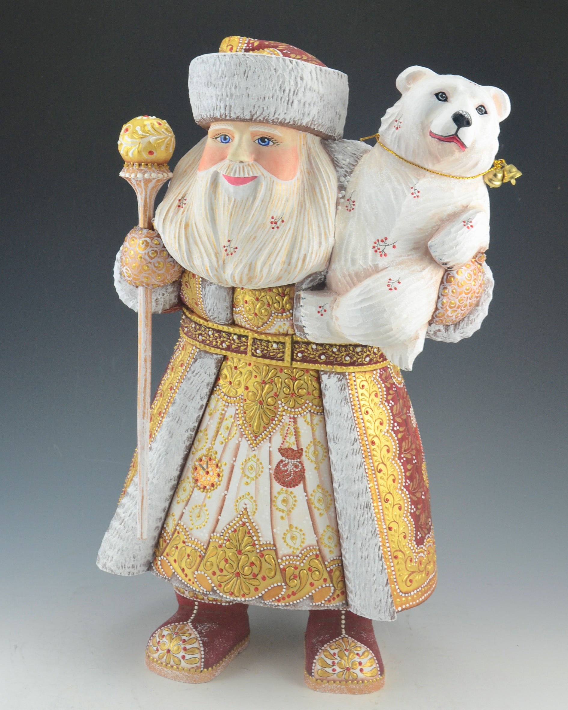 Beautiful Red Russian Santa Claus holding a staff in one hand and happy polar bear in the other hand. Ornately painted from his face and eyes all the way to his decorative boots. This Russian Santa is artistically painted in numerous coats, intricately detailed, sealed for protection and easy cleaning. All hand carved and hand painted, signed by the artist. One of a kind hand crafted, solid wood carving. Material: linden wood : 14.5 H (inches) Hand carved solid wood
