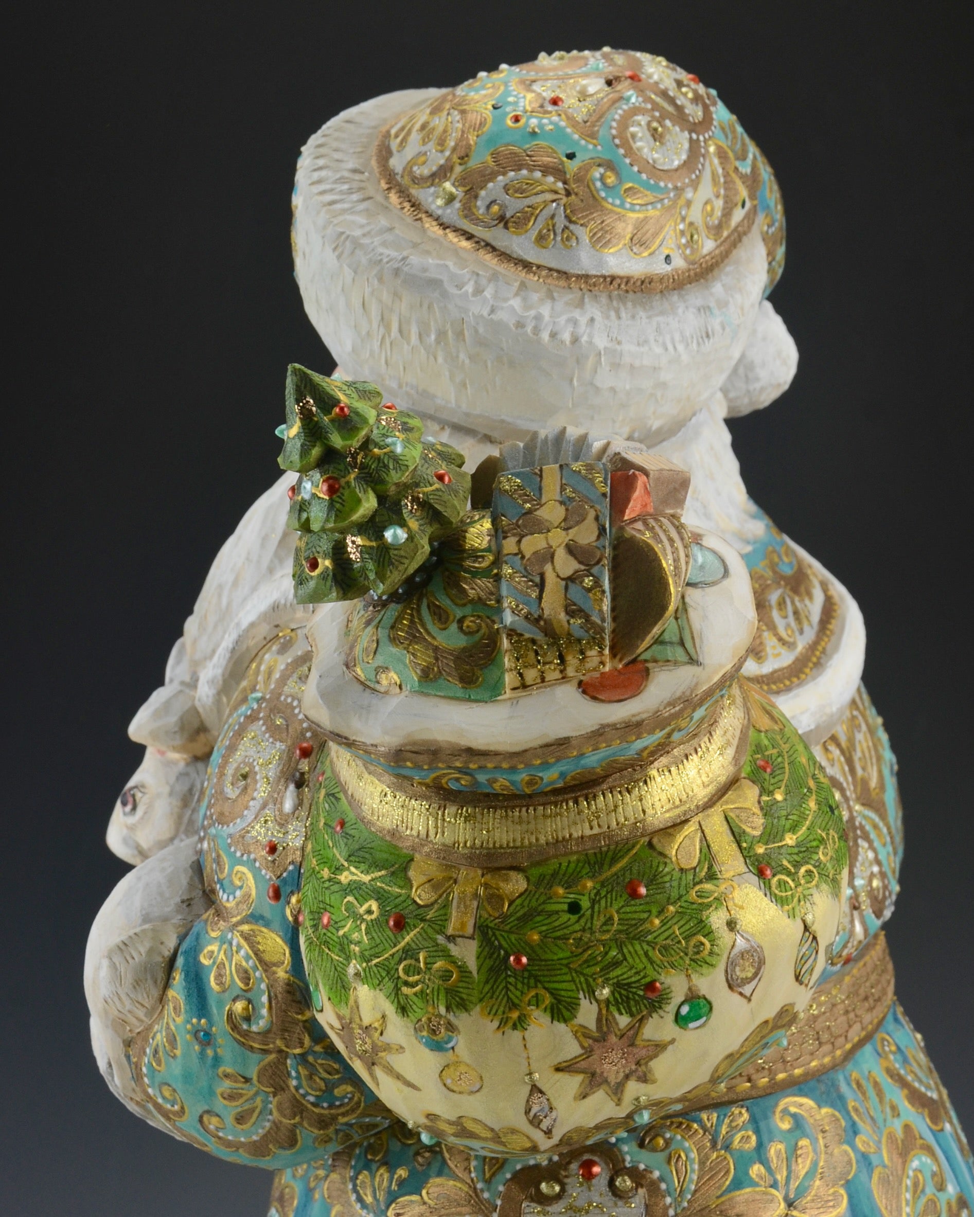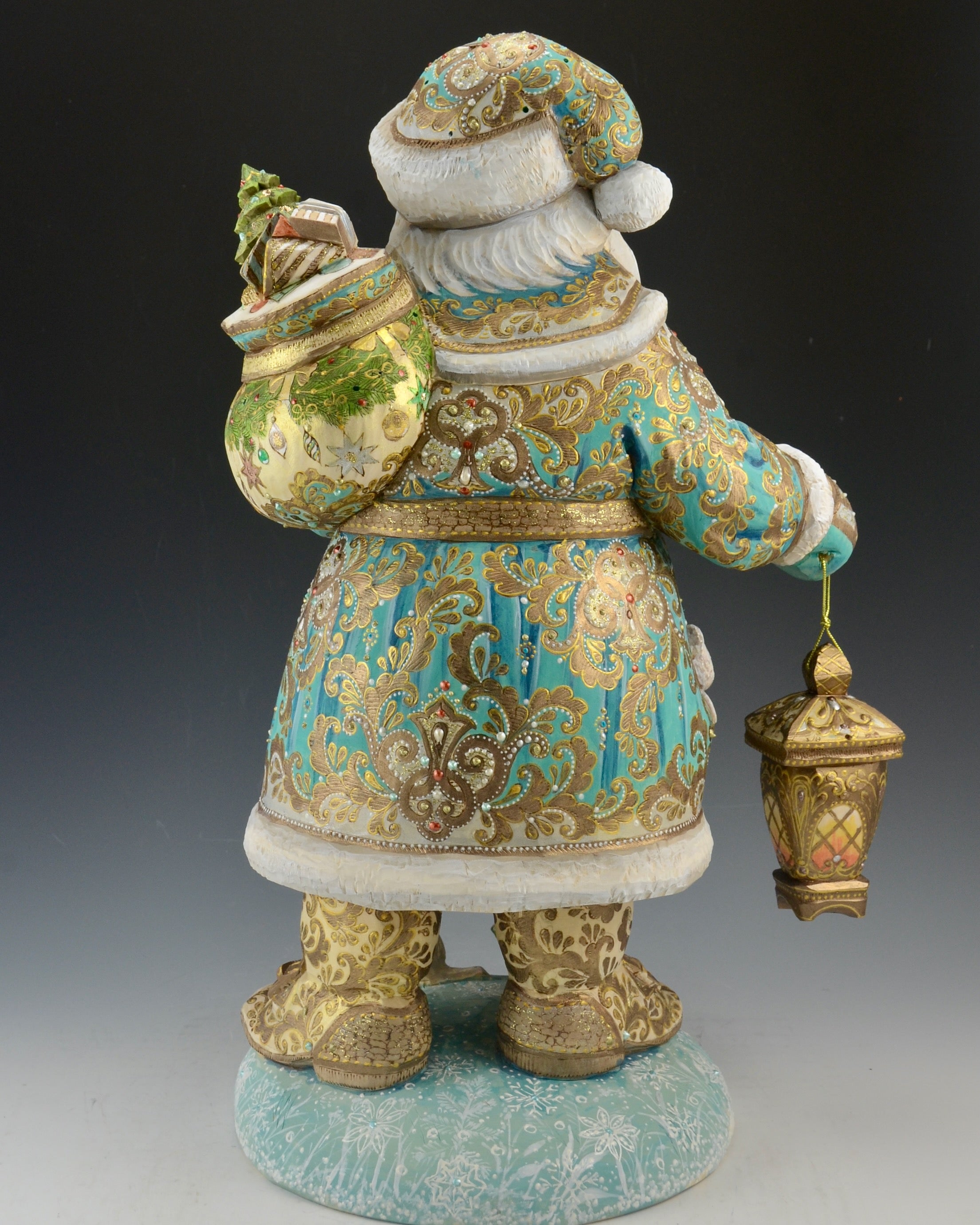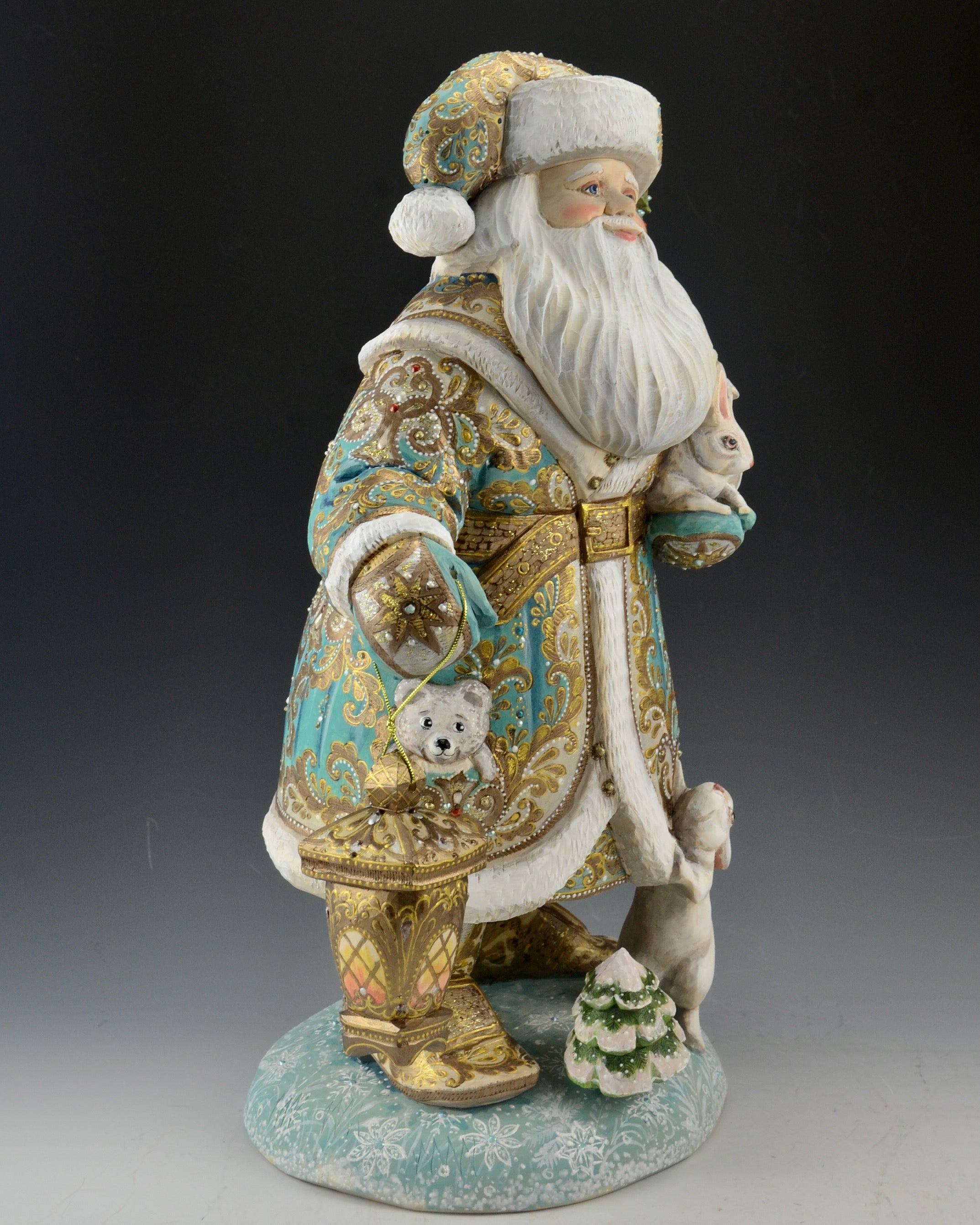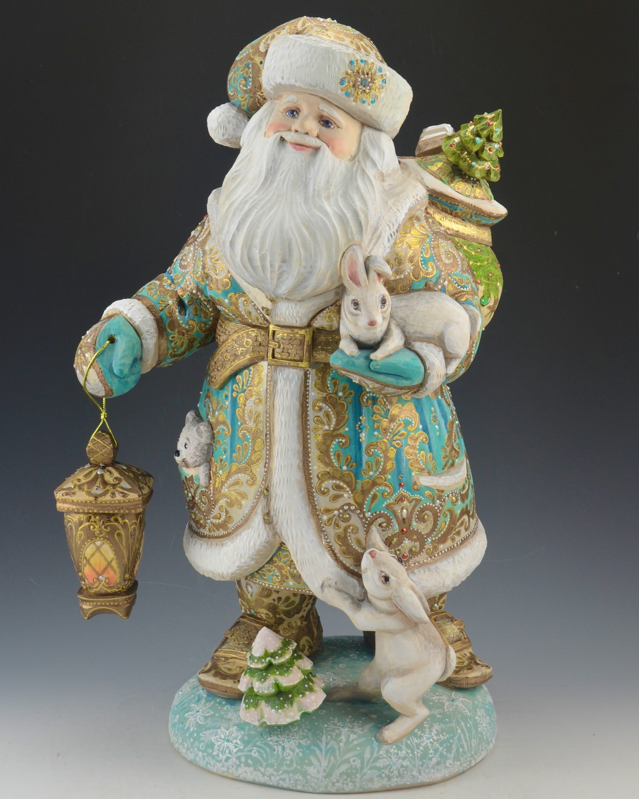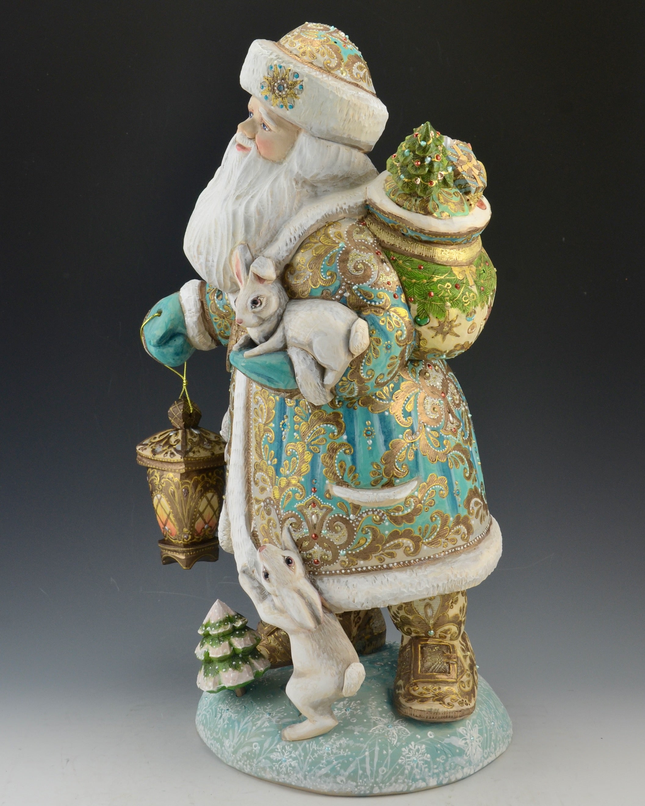 Gorgeous Santa carving painted in blue and gold tones with frosted trim. Santa has a toy bag over his shoulder, a lantern in one hand and one of two white rabbits in the other. There is another rabbit and small tree at his feet. A stunning piece from top to bottom. This Russian Santa is artistically painted in numerous coats, intricately detailed, sealed for protection and easy cleaning. All hand carved and hand painted, signed by the artist. One of a...