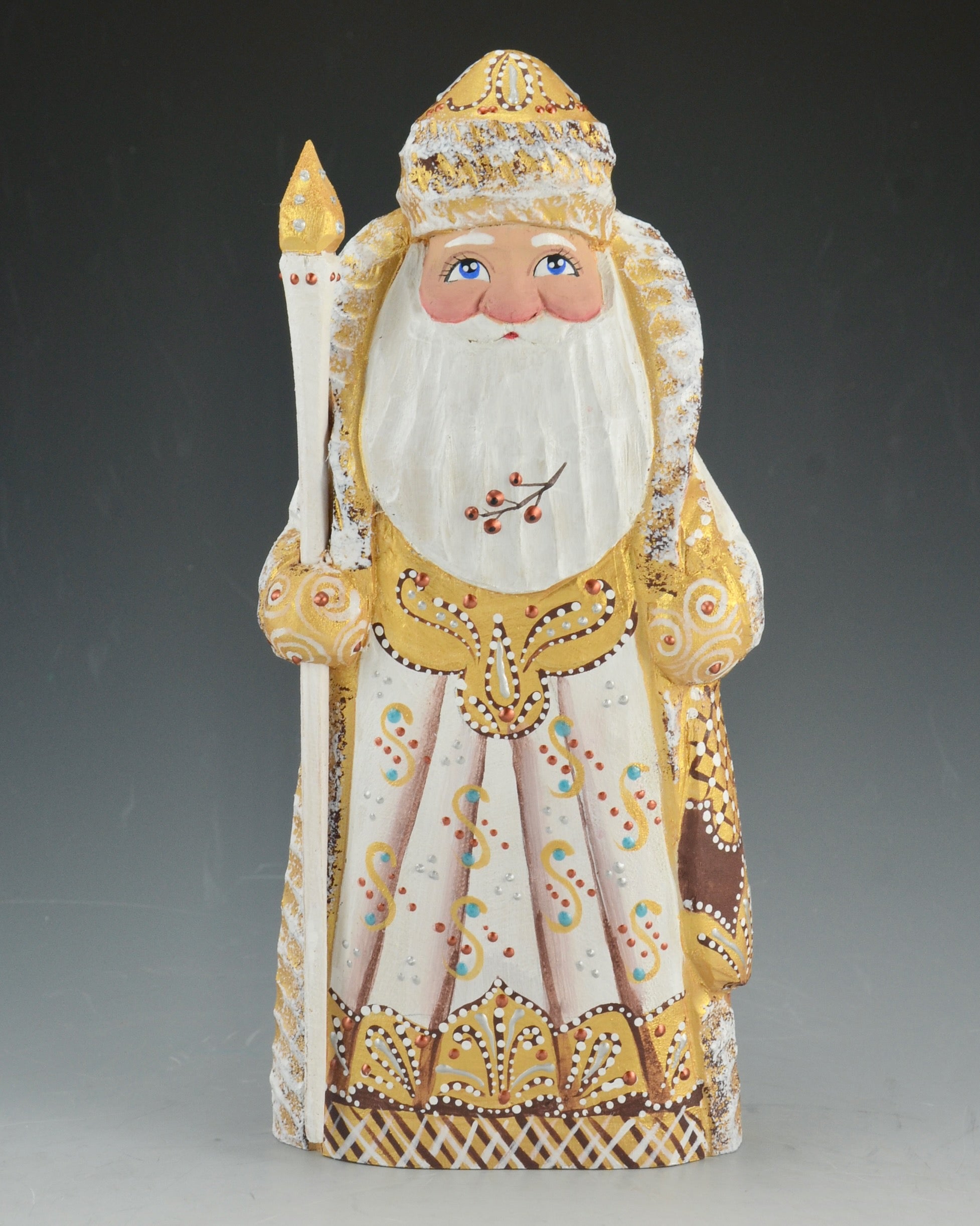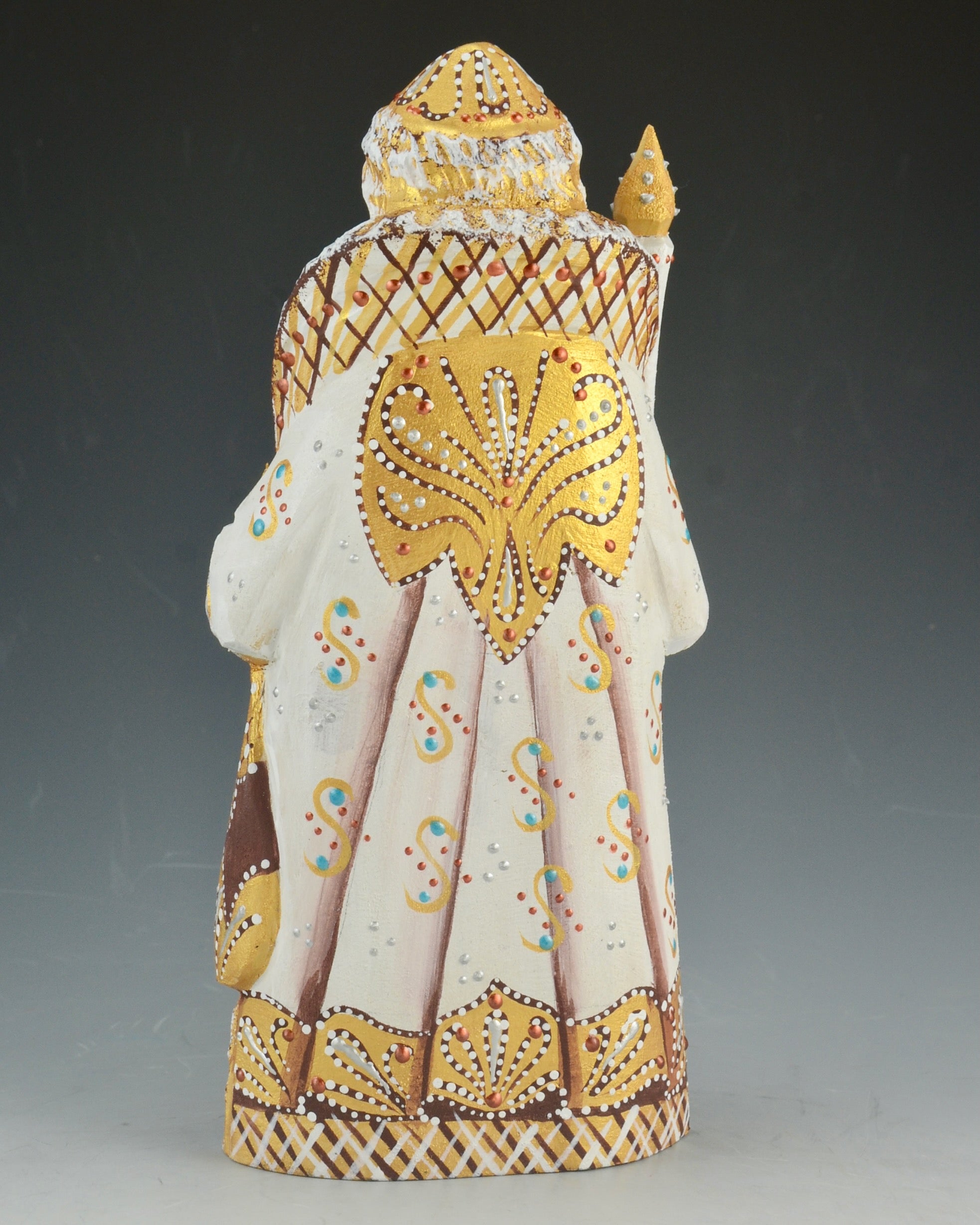 Detailed gold and white Santa carving with staff and toy bag. This Russian Santa is hand carved from solid linden. Once carved and sanded the Santa is hand painted and finished with numerous coats and finally signed by the artist. Material: linden wood: 7.5 inches tallHand carved solid wood